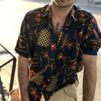 Men Retro Printed Short Sleeves Lapel Shirt