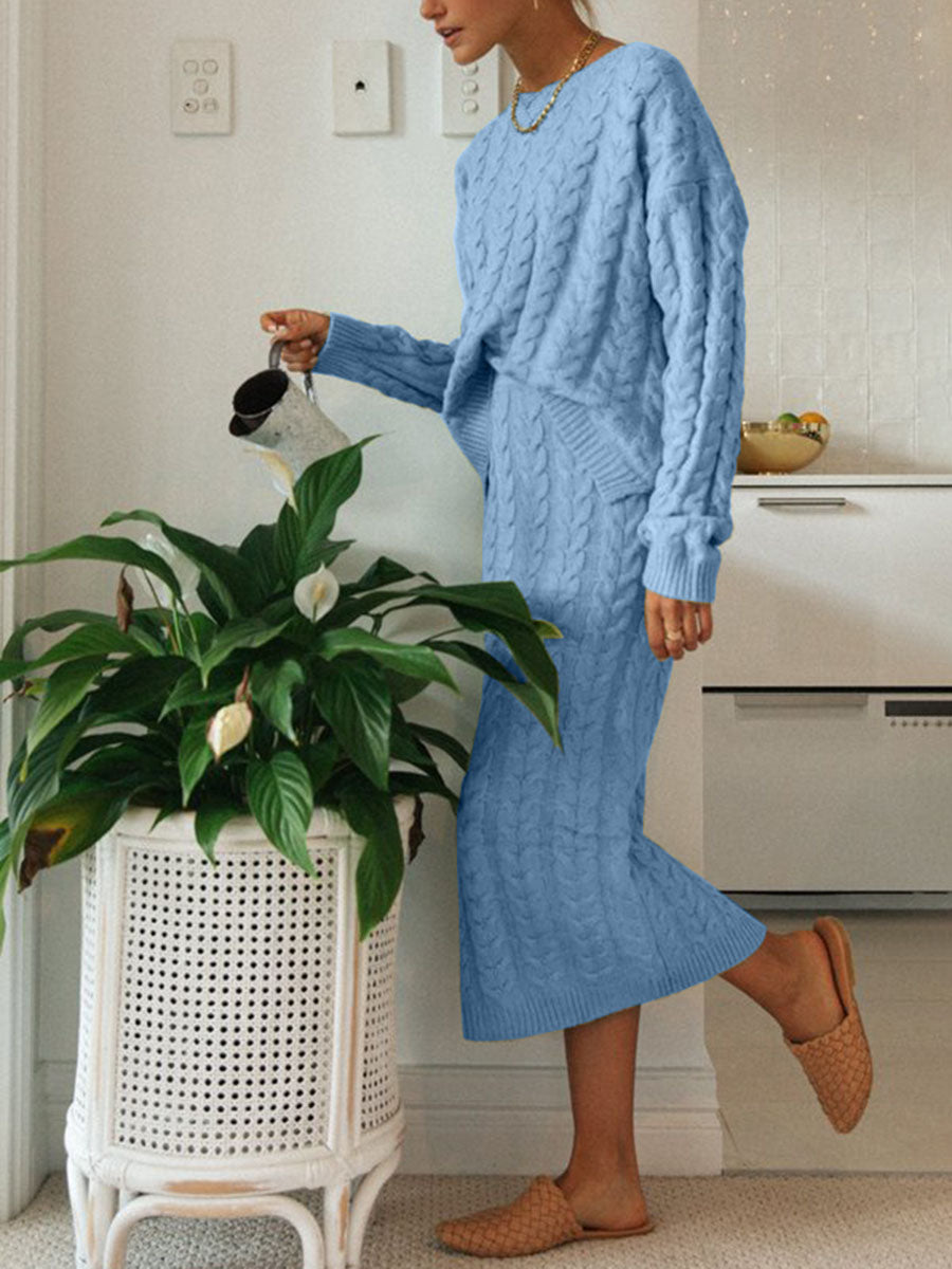 Simple Casual Loose Round Neck Long Sleeved Shirt Skirt Knit Suit